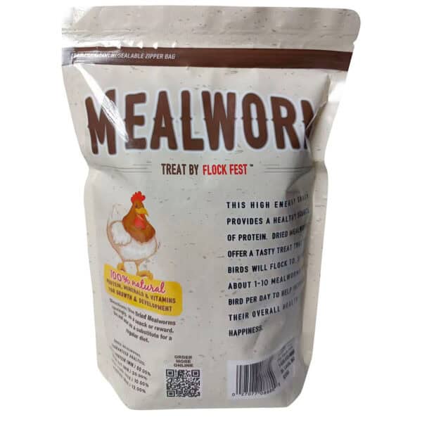 Give your flock a treat with the Flock Fest 10 oz Dried Mealworms 6 pack. Protein-rich and ideal for growth and development, 10 oz Dried Mealworms 6 pack are the perfect snack for poultry and fowl. With 50% crude protein, and 20% crude fat, these Meal Worms will help to increase the health and happiness of your chickens and ducks. Packaged in a resealable 10 oz bag, our Dried Mealworms do not require refrigeration, and have a long shelf life. Dried Mealworms are also great as a treat for small pets. Hamsters, hedgehogs, turtles, and fish will love the high protein treat. Mealworms can also help attract insect loving songbirds to your backyard. Item # DMW106
