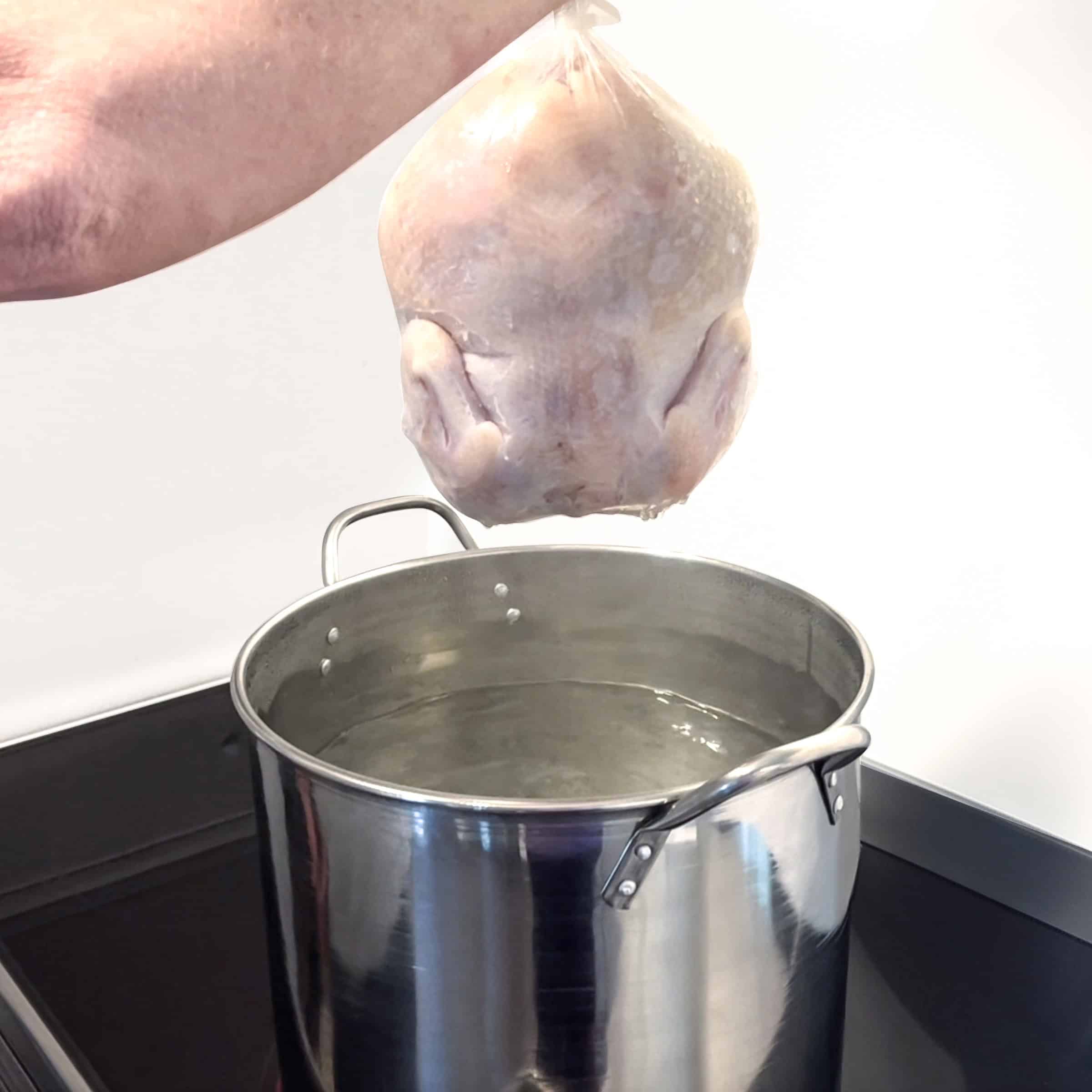 - Shrink the Bag: Next, I place the poultry in a pot of boiling water. The bag will shrink and conform to the poultry as it heats.